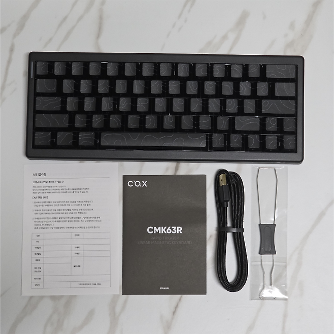 제품의 구성은 COX CMK63R 키보드 본품 1개, A/S 접수증 1장, 매뉴얼 1장, C타입 케이블 1개, 키캡 리무버 1개입니다.