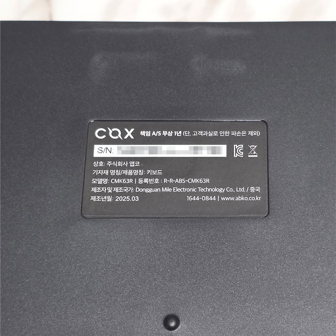 그리고 COX CMK63R 키보드의 바닥면에는 시리얼 넘버와 제조년월이 표기되어 있습니다.