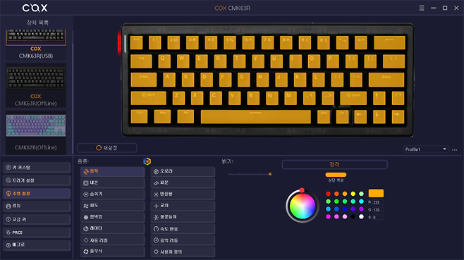 COX CMK63R 키보드는 다양한 RGB 색상을 지원하기 때문에 나만의 색상으로 커스텀할 수도 있어요.