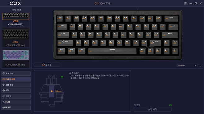 게다가 앱코 소프트웨어를 통해서 COX CMK63R 키보드의 래피드 트리거 설정도 할 수 있습니다.