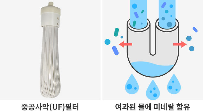 - 중공사막 필터: 저렴한 가격과 물속의 미네랄 성분은 걸러내지 않는 것이 장점이지만, 반대로 크기가 작은 미생물 및 기타 물질은 완벽하게 제거하지 못한다는 단점이 있다.