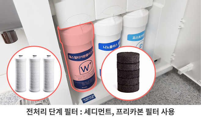 전처리 단계 필터는 수돗물이 정수기 들어가면 거치게 되는 첫 번째 단계라고 생각하시면 쉽습니다.