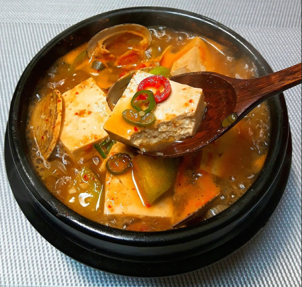 -손질한 오징어, 조개, 두부를 넣고 끓인다