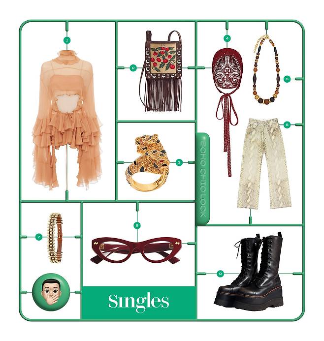 페스티벌 시즌은 벌써 풀가동(?) 중이다. 한껏 따스해진 날씨 따라 꽃 피듯 뮤직 페스티벌이 곳곳에서 열린다. 드디어 일상을 벗어나 마치 무대 위 뮤지션처럼 자유로운 스타일링을 뽐낼 시간! ‘페스티벌 룩’의 대표 주자이자, 작년부터 꾸준히 트렌드로 언급되고 있는 ‘보호 시크 룩’만 한 게 없다. 보호 시크 룩의 핵심은 화려함과 다채로운 레이어드지만, 좀더 현실적인 감각을 더해보는 건 어떨까. 옷의 화려한 패턴이나 컬러는 배제하고, 액세서리로 보호 시크의 느낌을 더하는 방식으로 말이다. 더불어 볼드한 주얼리 한두 개로 확실한 포인트를 주자.