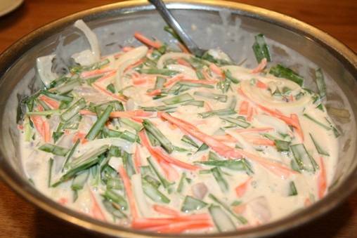 채소(부추, 시금치, 당근 등)와 해물 등을 넉넉히 넣어 식이섬유와 미네랄 섭취 늘리기