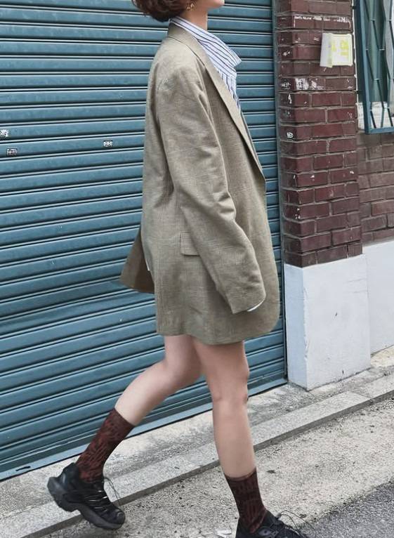 오버한 재킷과 짧은 팬츠의 조합은 필승이죠. 긴 기장의 양말로 시선을 끊어주면서 포인트도 살려요.
