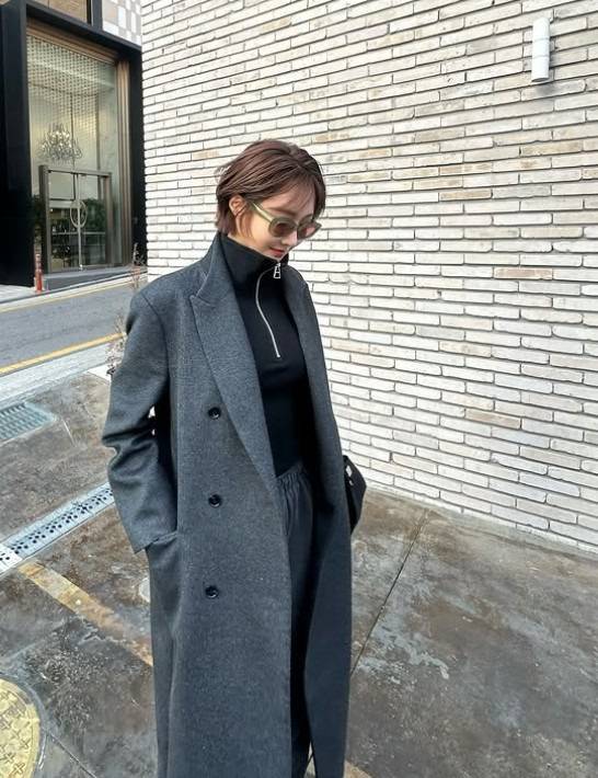 각 잡힌 롱코트를 정적인 느낌 없도록 연출했어요.
