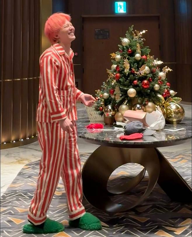 크리스마스트리 앞에서 스트라이프 잠옷 세트와 초록 슬리퍼를 착용한 그의 자연스러운 모습은 편안하면서도 특별한 연말 분위기를 자아내고 있습니다.