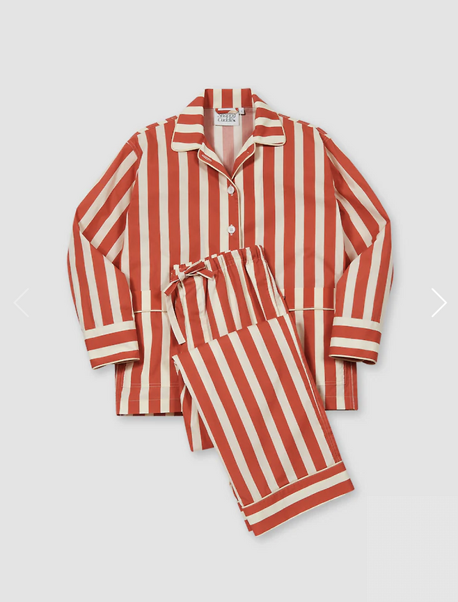 이 파자마 세트는 따뜻한 옐로우 앤 다홍 스트라이프 디자인으로,