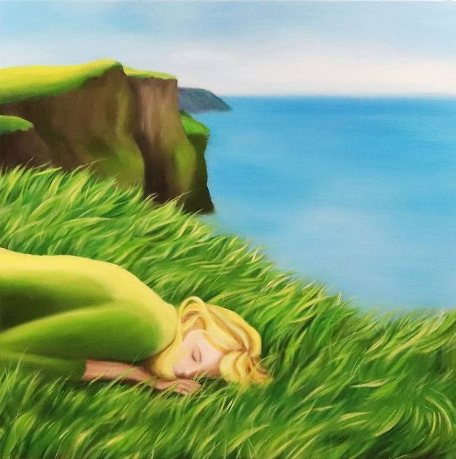 바다 절벽 위로 한 여인이 귀를 대고 누워 있습니다. 최고은 작가의 <나의 안부 6>입니다. 그림을 보자마자 풀이 일렁거릴 정도의 바람이 느껴지고, 마음이 고요해집니다.