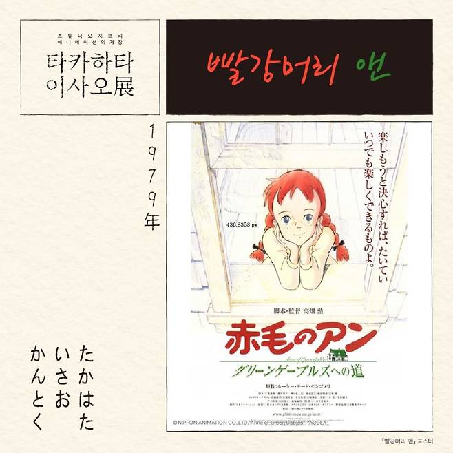 1979년에 TV 애니메이션으로 나온 <빨강머리 앤>입니다. 추억의 애니메이션으로 존재하다가 최근 몇 년 전부터 우리나라에 빨강머리 앤 열풍이 불어 빨강머리 앤을 소재로 한 전시와 책이 높은 인기를 얻기도 했는데요, 아마 타카하타 감독의 작품 중 가장 많은 한국 팬을 보유한 작품이 아닐까 싶습니다.