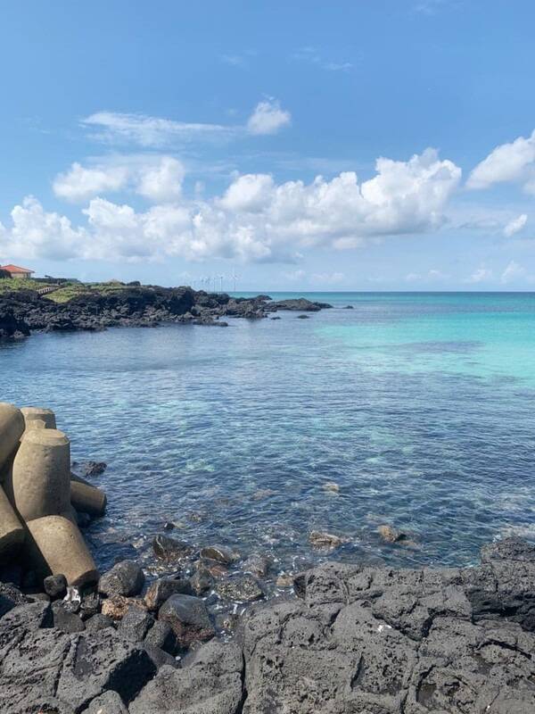 월령포구 인근에 샤워시설을 갖추고 있는 매점 겸 물놀이장비 대여 업체 '빡빡이스쿠버'가 운영되고 있는데요. 때문에 보유한 물놀이 장비가 없더라도 이곳에서 대여해 안전한 물놀이를 즐기기 좋습니다. 월령포구 뒤로 풍력발전기가 더욱 그림같은 스노클링 장면을 완성해줍니다.