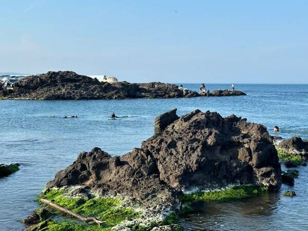 주변에 장비 대여점을 비롯한 편의시설이 없는 만큼 안전장비는 개별적으로 준비해가는 것이 좋은데요. 해변을 기준으로 오른편에 자연 바위가 물을 막고 비교적 얕은 수심의 자연 물놀이장을 형성하고 있습니다. 방파제 바로 앞으로는 수심이 얕지만, 급격히 수심이 깊어지는 구간이 있어 안전에 유의하는 것이 좋습니다.