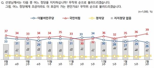 | ▲ NBS, 정당 지지도 추이(2월 3주) 전국지표조사(NBS) 2월 3주 자체조사 결과, 국민의힘 전당대회 컨벤션 선행 효과가 뚜렷하게 나타났다. |