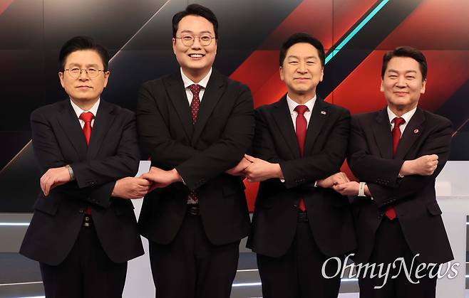 | ▲ 국민의힘 당 대표 경선 후보들이 15일 서울 중구 MBN 스튜디오에서 TV토론에 앞서 기념촬영을 하고 있다. 왼쪽부터 황교안, 천하람, 김기현, 안철수 후보. |