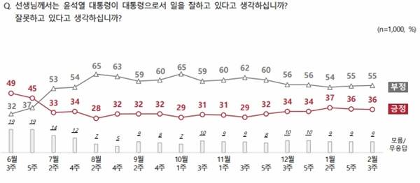 | ▲ NBS, 대통령 국정 긍정/부정 평가 추이(2월3주) 같은 조사에서 윤석열 대통령의 국정 수행 긍정/부정 비율은 횡보했다. |