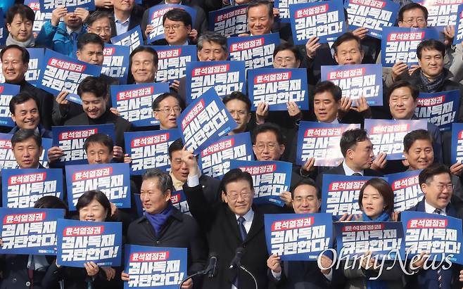 | ▲ 이재명 더불어민주당 대표가 지난 17일 서울 여의도 국회 본청 앞 계단에서 열린 윤석열 정권 검사독재 규탄대회에서 손을 들어 인사하고 있다. |