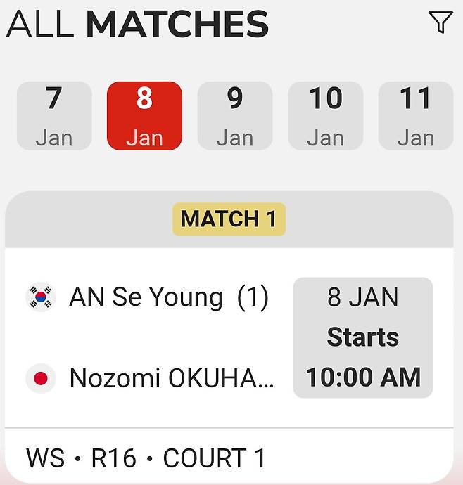 2026 시즌을 여는 말레이시아 오픈 슈퍼 1000에서 안세영 삼성생명과 노조미 오쿠하라 일본의 16강 맞대결 시간이 확정됐다. 대회 조직위원회가 공개한 일정에 따르면 두 선수는 8일 오전 11시 한국시간 쿠알라룸푸르 악시아타 아레나 1번 코트 첫 경기로 격돌한다.
