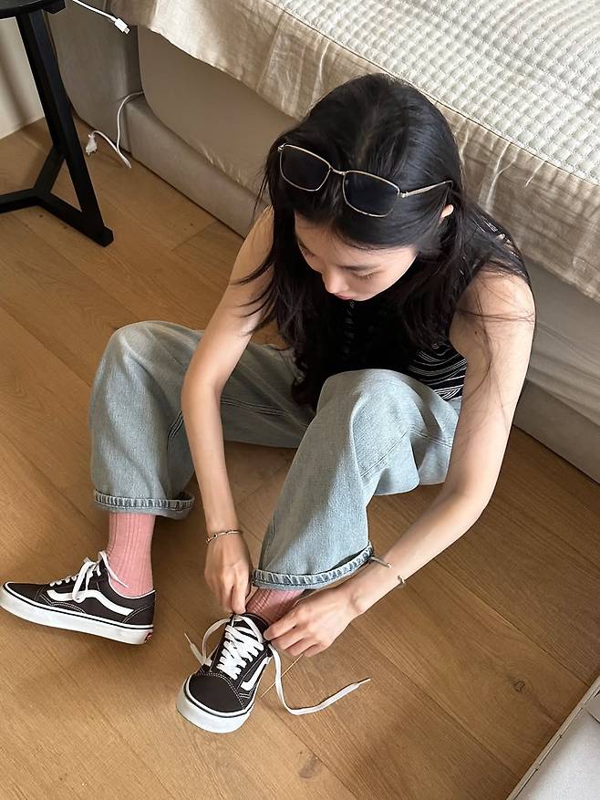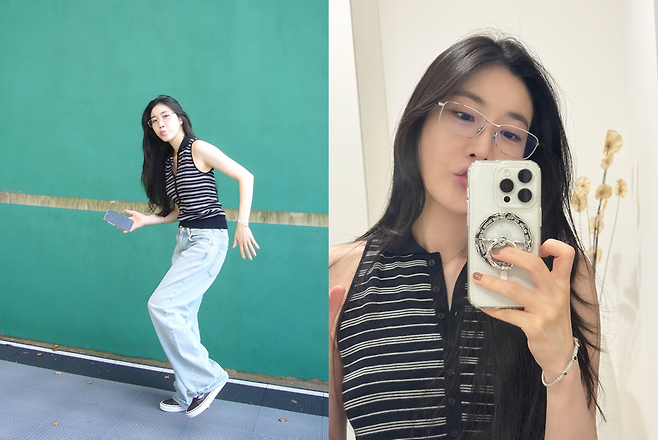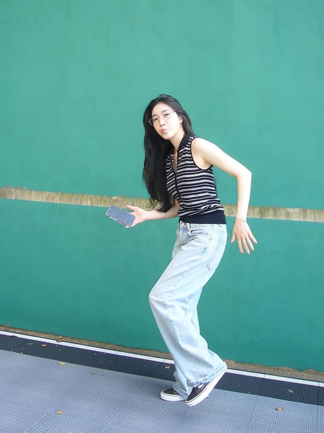 특히 편안한 스트라이프 민소매에 헐렁한 청바지를 입고 '깨방정'을 떠는 모습은