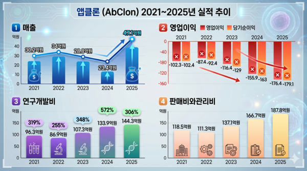 회사의 최근 구조도 플랫폼 자산 축적의 필요성을 뒷받침한다. 2025년 앱클론의 매출은 47억원으로 전년 23억원의 2배 규모로 늘었지만 영업손실 176억원, 당기순손실 179억원으로 적자 규모는 더 커졌다. 연구개발(R&D)비는 144억원으로 매출의 306%에 달했고 판매관리비도 188억원을 기록했다. 수익성보다 R&D 지속과 기술자산 축적이 더 중요한 구간인 셈이다.