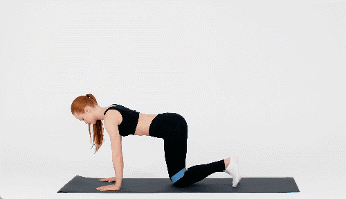 매트에 네발기기 자세를 잡고 허벅지에 밴드를 착용합니다. 복부에 힘을 주고 허리가 꺾이지 않도록 유지한 상태에서 왼쪽 다리를 무릎을 완전히 펴며 뒤로 뻗었다가 제자리로 돌아옵니다. 같은 방식으로 오른쪽 다리도 뒤로 뻗으며 반복합니다.