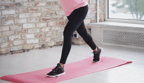 매트에 서서 준비한 뒤 왼쪽 다리를 앞으로 뻗어 무릎을 90도로 구부리며 런지 동작을 진행합니다. 손은 가슴 앞에서 모아 균형을 유지하고 반복합니다. 이어서 오른쪽 다리를 앞으로 뻗어 같은 방식으로 런지를 반복합니다.