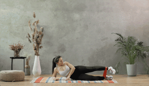 매트에 옆으로 누워 오른쪽 팔뚝으로 몸을 지탱하고 왼손은 바닥에 둡니다. 왼쪽 다리를 공중으로 들어 올렸다가 내리는 동작을 반복합니다. 반대쪽으로 돌아 누운 뒤 왼팔뚝으로 지탱하고 오른쪽 다리를 같은 방식으로 반복합니다.