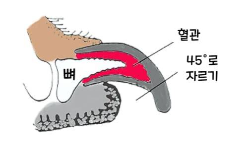 안쪽에 보이는 붉은 색의 혈관을 피해 45°정도(발을 디뎠을 때 발톱이 땅과 평행한 각도)인 대각선 방향으로 잘라주세요. 발톱이 검은색인 강아지도 플래시를 켜서 자세히 관찰하면 혈관이 보이기 때문에, 감으로 자르시지 말고 혈관의 위치를 꼭 확인하고 잘라주셔야 합니다.