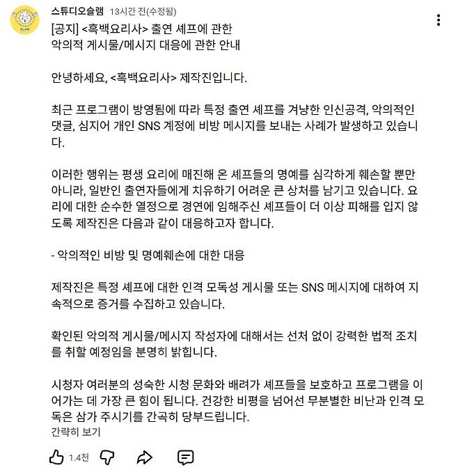 사태가 심각해지자 '흑백요리사' 제작사인 스튜디오 슬램은 1월 6일 공식 입장을 통해 강력한 법적 대응을 선언했습니다. 제작진은 "특정 셰프를 겨냥한 인신공격성 게시물과 악의적 비방에 대해 지속적으로 증거를 수집 중"이라며 "선처 없는 강력한 법적 조치를 취할 것"이라고 경고했습니다.