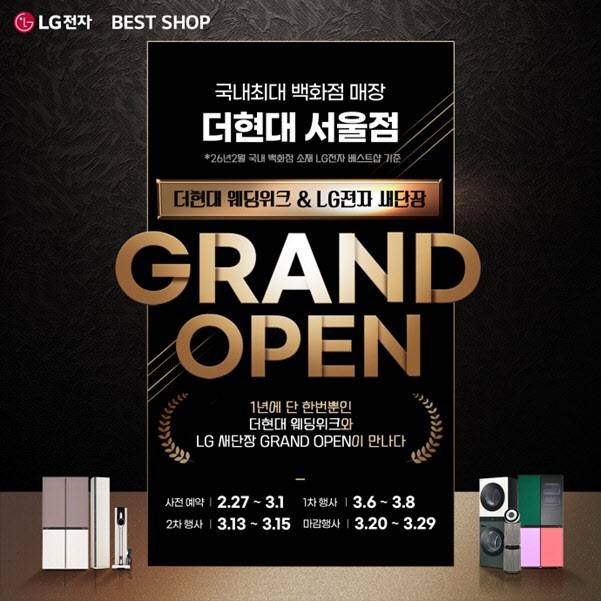 2026년 2월 국내 백화점 소재 LG전자 베스트샵 기준 국내 최대 규모 백화점 매장인 LG전자 베스트샵 더현대 서울점이 1년에 단 한 번뿐인 '더현대 웨딩위크'와 'LG 새단장 그랜드 오픈'을 기념하여 대규모 가전 행사를 진행한다.