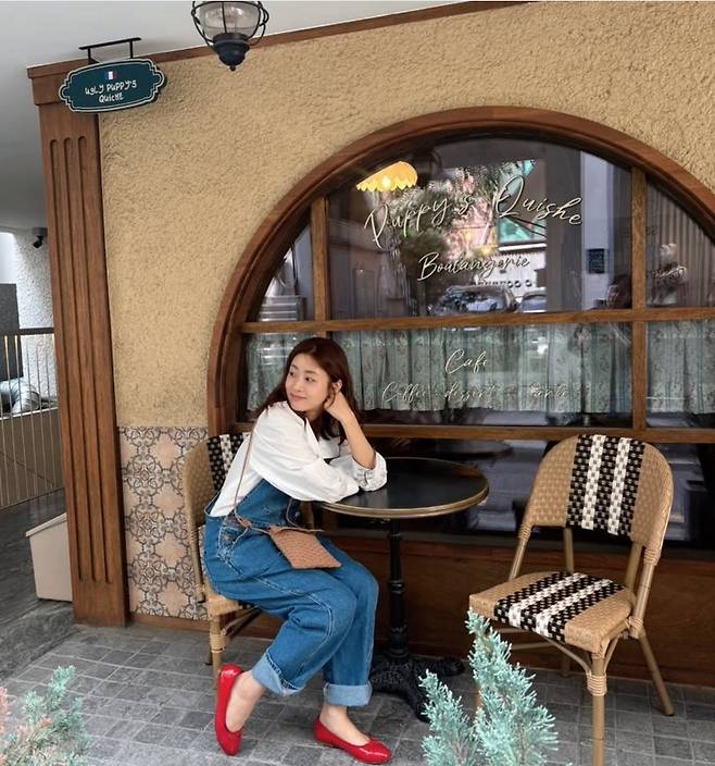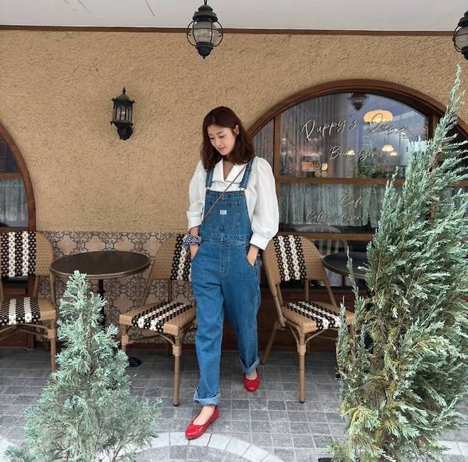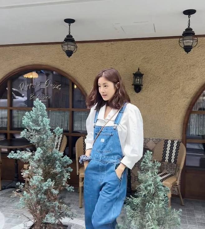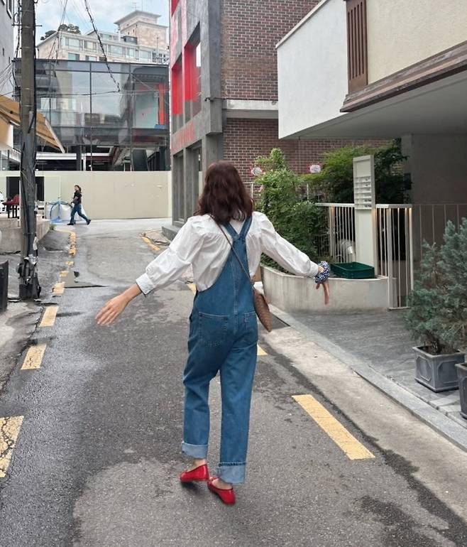 데님 오버올 팬츠에 볼륨감 있는 셔츠를 매치해 내추럴하면서도 발랄한 데일리룩을 선보였습니다.