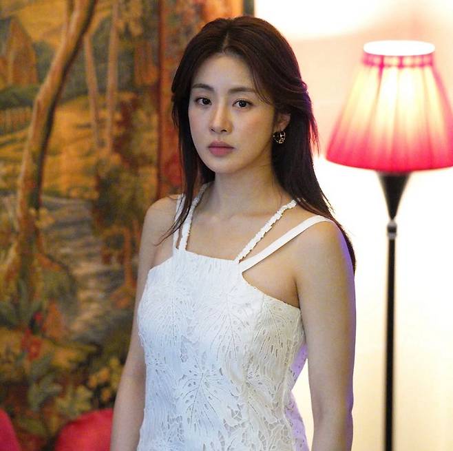 화이트 레이스 디테일의 슬리브리스 드레스를 착용해 청순하고 로맨틱한 분위기를 연출했습니다.