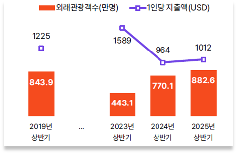올해 상반기 방한 외국인 관광객 수는 코로나19 팬데믹 이전인 2019년 상반기(844만 명)를 뛰어넘으며 뚜렷한 회복세를 보였다. 특히 아메리카와 유럽 지역 관광객이 각각 46.2%, 18.8% 증가하며 긍정적인 신호를 보였다.