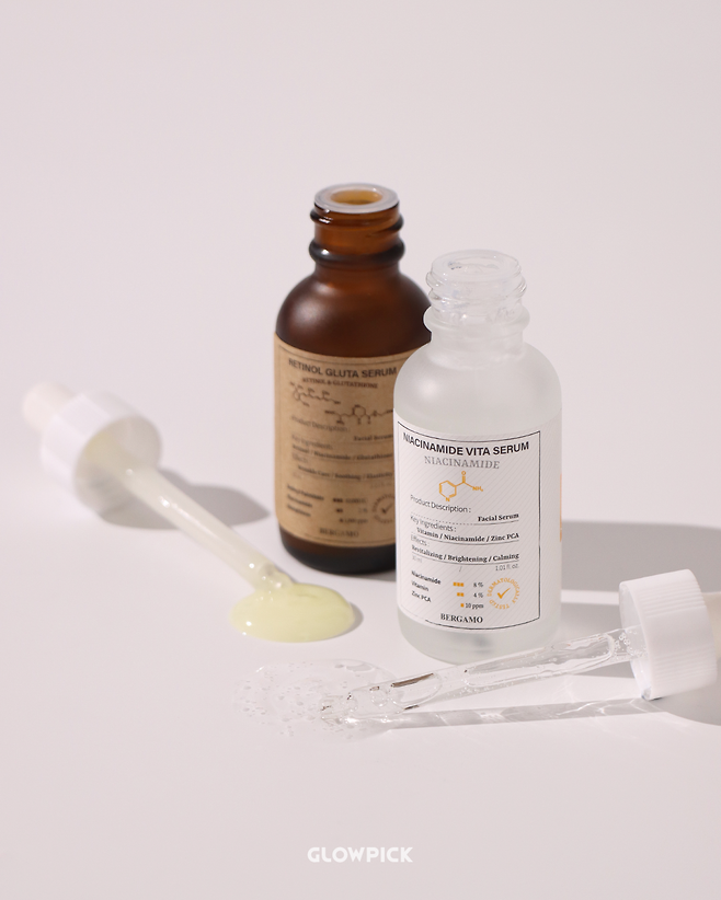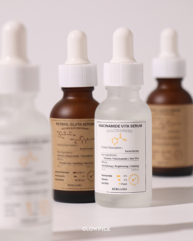핫한 성분 레티놀과 글루타치온을 최고 함량으로 담아낸 베르가모의 프리미엄 세럼으로 더 완벽해지는 스킨케어! 프리미엄 레티놀 글루타 세럼은 레티놀을 최대치로 담아낸 이 세럼은 순한 사용감에 먼저 감탄하는 제품인데요. 진정 성분을 추가하여 피부에는 편안한 사용감을 자랑하죠. 탄탄하게 피부를 채워 피부에 더욱 생기를 돌게 만들어요. 프리미엄 나이아신아마이드 비타 세럼은 고함량 비타민으로 피부를 밝히고 보습 케어까지 한 번에! 나이아신아마이드와 비타민 콤플렉스를 담은 산뜻한 타입의 세럼인데요. 사용 후의 속광까지 피부를 더욱 환하게 만들어줘요.