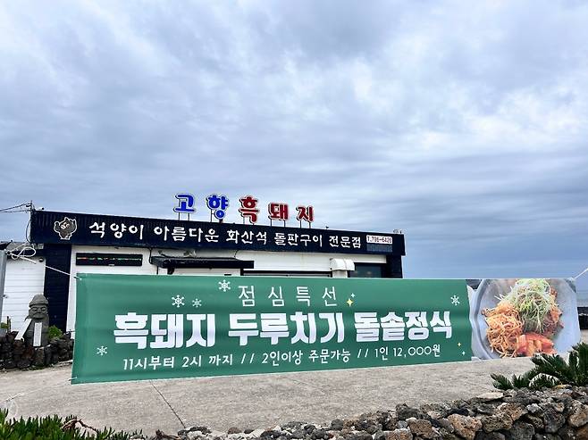 한림항 근처 포구 끄트머리쯤 자리한 고향흑돼지의 대표 메뉴는 흑돼지 2인 세트다. 흑돼지 오겹살과 목살 400g, 전복 2개, 새우 4개, 소시지 1개가 포함된 메뉴로, 가격은 52,000원. 세트 메뉴가 아닌 목살 또는 오겹살만 주문해도 상관없지만 이왕이면 1인 4,000원을 추가해 세트 메뉴를 맛보는 걸 추천한다.