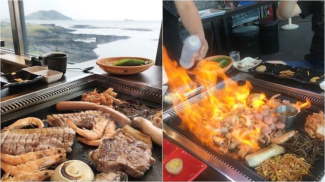 우리 일행은 셋이라 비양도가 한 눈에 들어오는 창가에 자리를 잡고 세트 메뉴를 주문했다. 하늘이 흐려 멋진 일몰까지 마주하진 못한 건 살짝 아쉽다.
