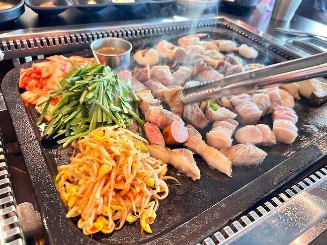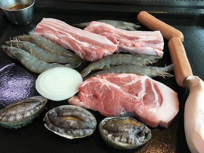 잠시 후 내온 메뉴. 흑돼지 3덩이와 새우 6개, 전복 3개, 소시지 2개다. 고기, 해물에 더해 버섯과 양파까지 불판 위에 함께 올려졌다.