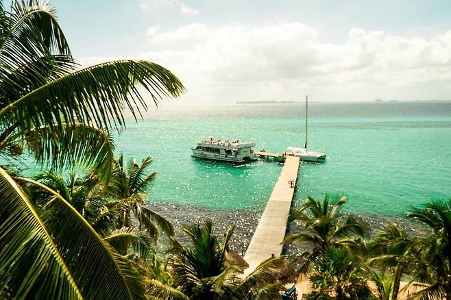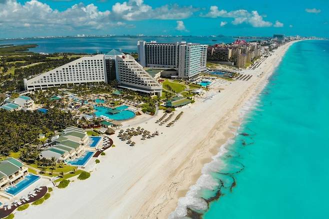 칸쿤은 크게 호텔존과 다운타운으로 나뉘며, 신혼여행객 대다수는 바다 전망이 펼쳐지는 호텔존을 선호합니다. 이 구역은 바다와 리조트가 일직선으로 이어져 있어 발코니에서 터키색 바다를 내려다보는 ‘로망’을 현실로 만들어주죠.