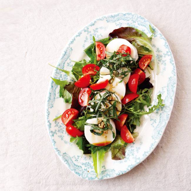 5 접시에 어린잎 채소를 담고 그 위에 순두부를 올린다. 깻잎과 방울토마토를 곁들인 뒤 드레싱을 뿌려 완성한다.