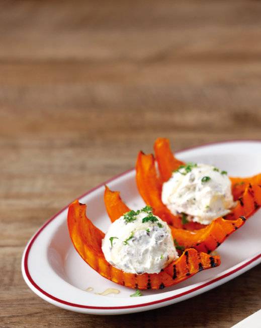 2 달군 그릴 위에 호박을 올려 굽는다. 이때 속까지 익도록 천천히 낮은 불에서 익힌다. (160℃로 예열한 오븐 혹은 에어프라이어에 넣고 10~15분 정도 완전히 익도록 구워도 좋다.)