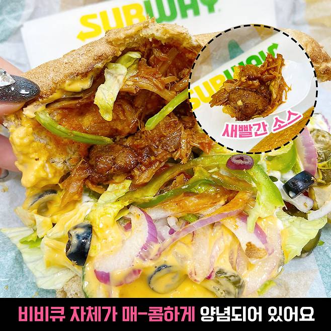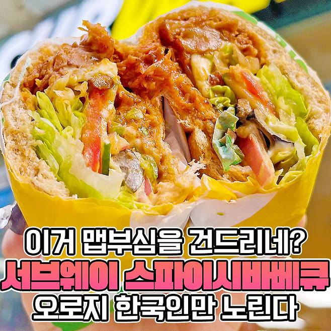 역시 서브웨이 단면은..bb 보는 것 만으로도 침이 꼴깍 넘어가요. (방금 먹고 왔음) 스파이시 바베큐는 매운 바베큐 + 서브웨이 기본 야채 + 위트 빵으로 구성되었네요!