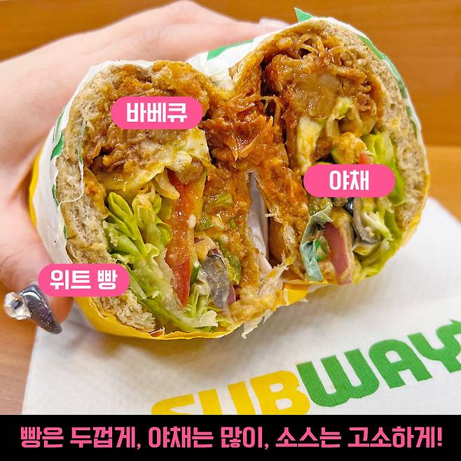 동일한 이유로 야채도 듬뿍 넣어주는 걸 추천! 소스는 자유지만, 고소한 소스(랜치, 마요 등등)를 한 가지 넣도록 해요 :>