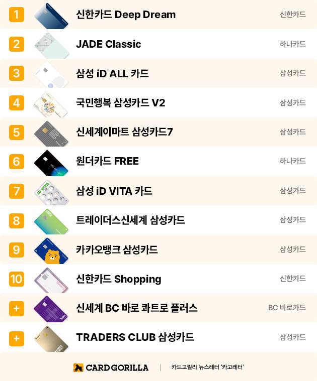 ์ฐจํธ ์ TOP10 ์นด๋ ์ค ์ผ์ฑ์นด๋๊ฐ ๋ฌด๋ ค 6์ข ์ด๋ ์ฐจ์งํ๋๋ฐ์. ํธ๋ ์ด๋์ค ํ ์ธ๊ณผ ํจ๊ป ์ํ๋น ํ ์ธ์ ์ ๊ณตํ๊ธฐ ๋๋ฌธ์, ์ด์ฉ๋ค ํธ๋ ์ด๋์ค๋ฅผ ๊ฐ๋๋ผ๋ ์ถฉ๋ถํ ํ ์ธ ๋ฐ๊ธฐ ์์ํ ๊ฑฐ์์.