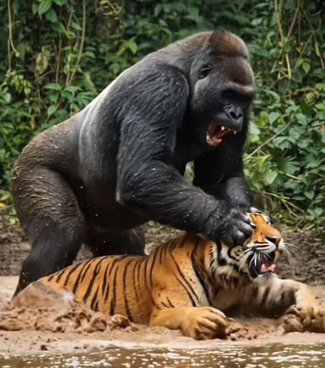 힘도 강한 고릴라가 싸움에서 유리한 듯 보이는 모습인데요