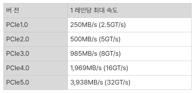 PCIe 1세대에서 5세대까지 각 세대별 차이점은 '데이터 전송 속도의 차이'다. 위 표를 보면 세대가 하나 올라갈 때마다 전송 속도가 기존의 2배로 향상되는 것을 볼 수 있다. 결과적으로 PCIe 1세대와 5세대는 전송 속도 차이가 16배에 달한다.