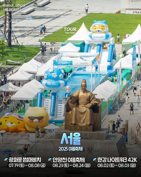 서울 2025 여름축제는 무더위를 잊을만큼 시원한 축제가 주를 이룹니다. 서울 광화문광장에 조성되는 여름 물놀이장, 광화문 썸머비치가 7월 19일 토요일부터 8월 8일 금요일까지 진행될 예정인데요. 카카오톡 캐릭터를 활용한 워터 슬라이드도 설치되어 여름 더위를 무료로 잊을 수 있습니다.