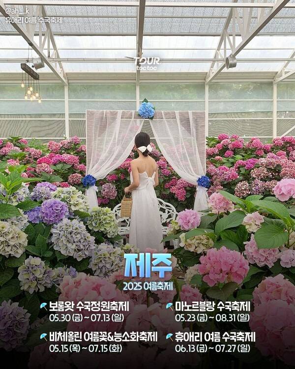 휴애리 여름 수국축제는 6월 13일부터 7월 27일까지 개최됩니다. 전통 돌담과 야자수가 배경이 되어 가장 제주스러운 풍경을 마주할 수 있는데요. 넓은 정원 곳곳에 수국을 비롯한 다양한 식물이 식재되어 있을 뿐 아니라, 감성적인 포토존도 많아 여름 인생사진을 남기기에도 좋습니다.