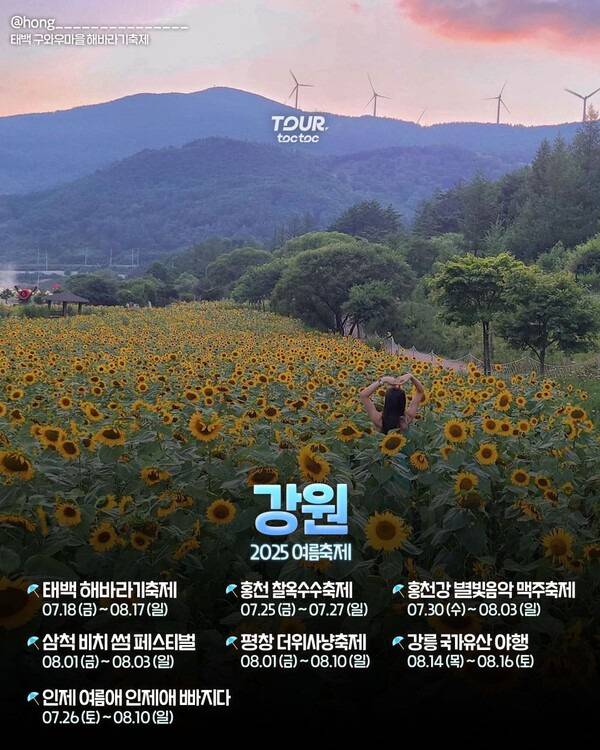 강원도는 자연과 함께하는 여름축제가 풍성하게 펼쳐집니다. 해발 800m의 태백 구와우마을에서는 100만송이 해바라기 만개 시기에 맞춰 7월 18일 금요일부터 8월 17일 일요일까지 태백 해바라기 축제가 개최됩니다.