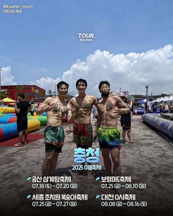 2025 충청도의 여름은 이색적인 축제들로 가득할 예정입니다. 특히 대천해수욕장 일원에서 개최되는 보령 머드축제가 7월 25일부터 8월 10일까지 약 2주간 이어지는데요. 해변 바로 앞, 피부에 좋은 머드를 온몸으로 체험할 수 있어 외국인 관광객들도 많이 찾는 이색 여름축제로 손꼽힙니다.