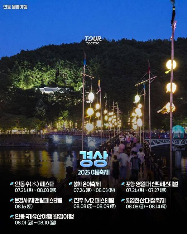 시원한 여름 축제와 낭만적인 여름축제가 풍성하게 열리는 경상지역의 2025 여름축제 일정입니다. 안동에서는 시원한 물놀이를 즐길 수 있는 수(水)페스타가 7월 26일부터 8월 3일까지 개최되며, 8월 1일부터 10일까지는 국가유산야행 '월영야행'이 진행돼 여름 밤 고풍스러운 야경 속의 산책을 즐길 수 있습니다.